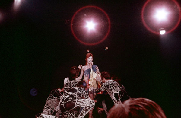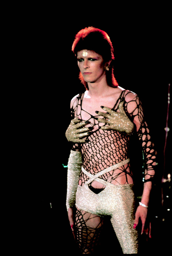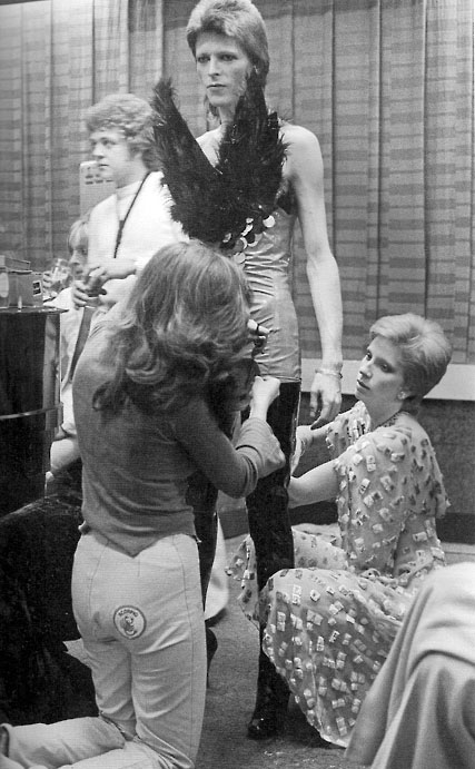Bowie vanished again to change, re-emerging in thigh length black PVC boots, a scarlet PVC corset, a big feather starting at his navel and extending up past his ears and matching feather wristlets.