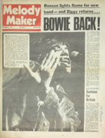 That's the strong report which reached MM this week when it was revealed Bowie will be performing at one of the Lou Reed concerts. Reed is starting a major British tour at Melody Maker's Crystal Palace Garden Party on September 15 and will include dates at Glasgow, Manchester, Liverpool and Southampton before ending at the Birmingham Odeon on October 3. MM understands Bowie is planning only one concert appearance. He has completed recording sessions for his next album, Pin Ups, co-produced by Mick Ronson - who has since formed his own band. In the line-up for Ronson's band will be Aynsley Dunbar (drums), ex-Spider Trevor Bolder (bass) and Mike Garson (keyboards). Garson has played on all of Bowie's more recent albums and toured with the Spiders in both the States and Britain. Ronson told MM "We're leaving for France this week where we'll start recording at the Château. At the moment I can't say what the sessions will produce, but we'll be staying there for about a month." An album and single are expected to be released later this year and it's likely Ronson will take the band on the road at the same time. Commented Ronson: "There's a lot of different things happening at the moment and it's going to take time for them all to happen." |