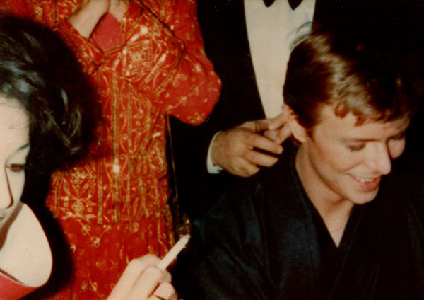 Bowie in a blue kimono, baggy trousers and clogs; his date Viv Lynn in Willie Brown, ignoring the Twenties-style/black tie dress code