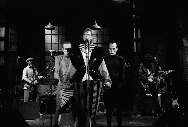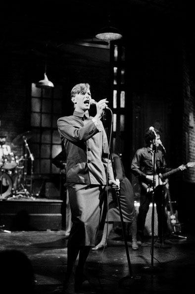 Bowie devised three set pieces based on Tristan Tzara’s Cabaret Voltaire skits and John Heartfield’s photomontages with help from SNL set designer Mark Ravitz, who had worked on the Diamond Dogs set in 1974. Bowie’s costume, a solid moulded plastic body painted in Thirties evening dress with a large bow tie, was made by SNL’s theatrical suppliers Brooks Van Horn.